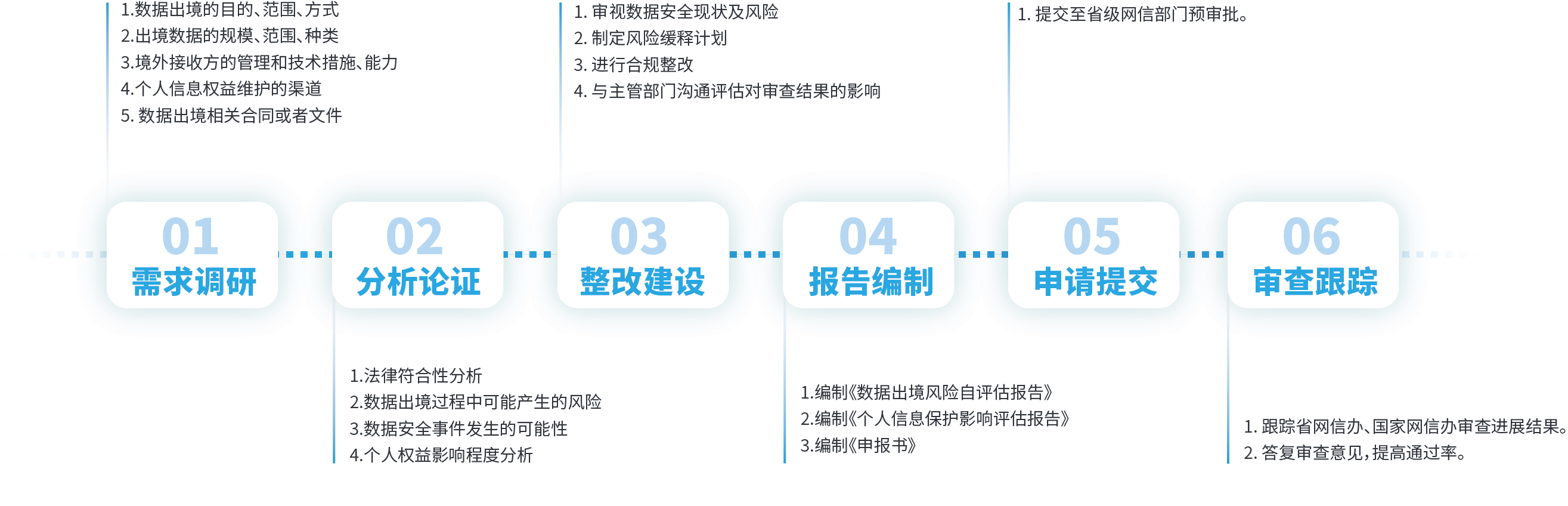 (2)主管部门审批过程跟进及沟通解决:协助企业对网信办审查过程中反馈问题的答复和补充修改;协助企业在每年1月31日前编制《数据出境安全报告》,向属地网信办报告。