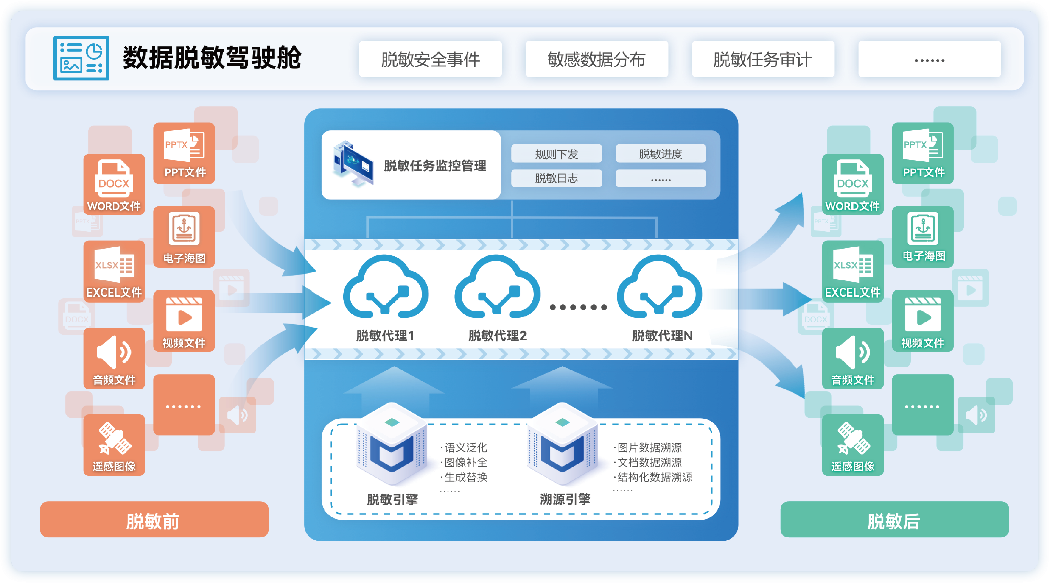 系统基于先进的人工智能与信息隐藏技术,针对敏感数据的共享流通场景,通过插件式的脱敏代理,按照设定的规则,自动实现敏感区域识别、敏感信息脱除、接收方信息嵌入等处理,实现数据价值无损脱敏和溯源能力植入,切实保护隐私和促进数据流通利用。通过脱敏驾驶舱和任务管理可实现脱敏任务集中管理和效果呈现,使数据脱敏可管、可控、可视、可审计、可追溯,提升数据安全管理能力。