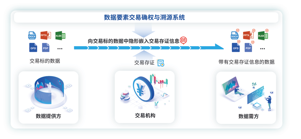 系统基于国际领先的多模态数字隐形水印技术,将交易存证信息隐藏到交易的数据要素中,不改变数据格式,不影响数据使用,使得交易存证信息与数据一起流转,必要时可从数据中提取出交易存证信息,精准定位交易双方、交易时间、交易授权等信息,达到追溯违规扩散、越权使用等非法侵权行为源头的目的。从而有效保护交易数据的安全,保障数据交易过程中相关各方的合法权益,为数据要素良性、有序交易保驾护航。