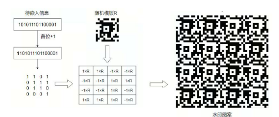 水印图案生成,根据随机模块R和二值化的待嵌入信息进行编码得到二值化的水印图案,提升了解码的安全性与便捷性;