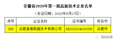 近日,安徽省科学技术厅发布了《关于公布安徽省2020年第一批高新技术企业认定名单的通知》,经安徽省科技厅、安徽省财政厅、国家税务总局安徽税务局联合评定,合肥高维数据技术有限公司再次获评国家级高新技术企业。