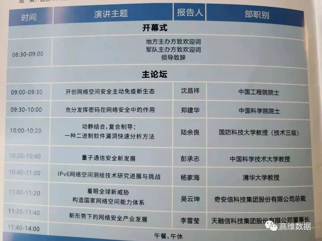 主论坛分别邀请了中国工程院院士沈昌祥、中国科学院院士郑建华、国防科技大学陆余良、中国科学技术大学彭承志教授、清华大学教授杨家海、奇安信总裁吴云坤、天融信董事长李雪莹等专家、学者发表主旨演讲。