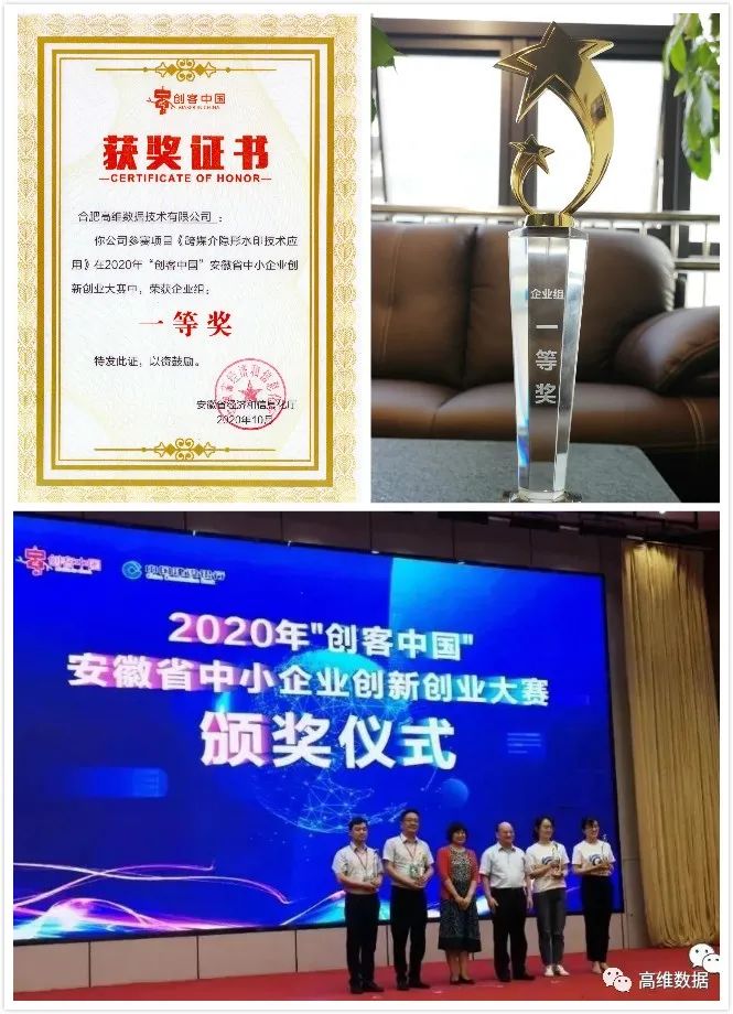 9月8日,2020年“创客中国”安徽省中小企业创新创业大赛颁奖仪式在建设银行安徽分行举行。高维数据“跨媒介隐形水印技术应用项目”从企业组403个参赛项目中脱颖而出,获得一等奖(共2名)。