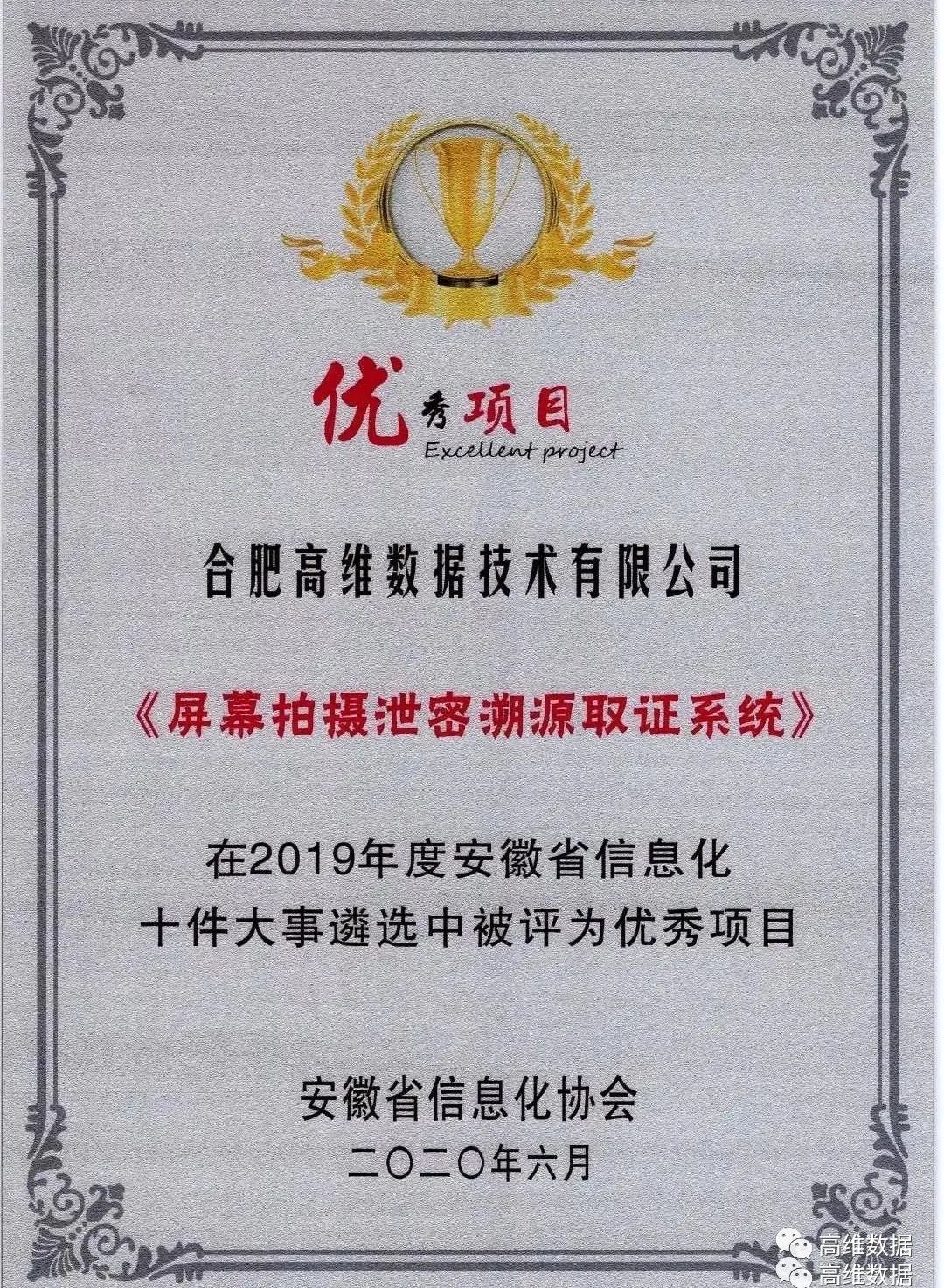 10月16日,经安徽省信息化协会(省经信厅)初评和省“信息化十件大事”专家组最终评审,高维数据“屏幕拍摄泄密溯源取证系统”项目被评为2019年度安徽省信息化“优秀项目”奖。