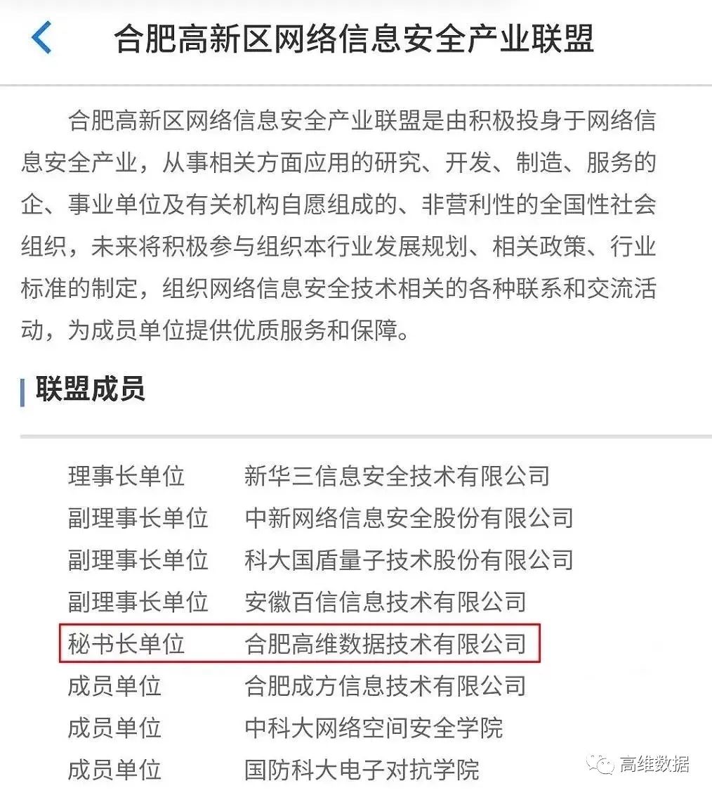 1月15日,合肥高新区网络信息安全产业联盟成立,高维数据当选为秘书长单位,共同为创建“中国安全谷”添砖加瓦。