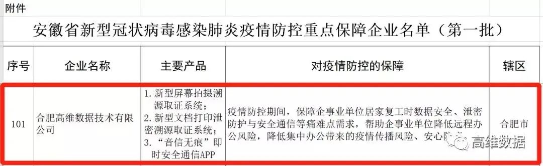 2月14日,安徽省新型冠状病毒感染肺炎疫情防控重点保障企业名单公示,高维数据被列入安徽省疫情防控重点保障企业。公司新型泄密溯源取证系列、安全通信等多个创新产品入选。