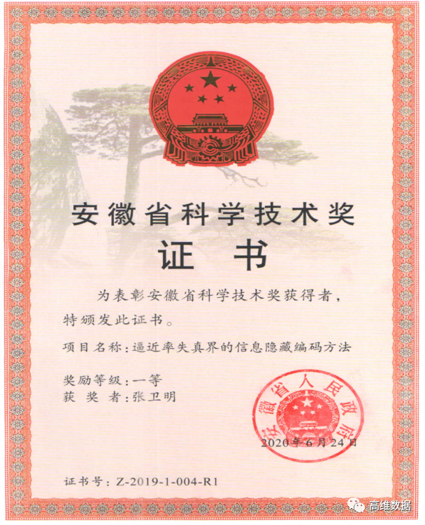 6月29日,安徽省科学技术奖励大会举行,发布了2019年度安徽省科学技术奖名单。公司总工程师张卫明、首席科学家俞能海两位教授的研究成果“逼近率失真等信息隐藏编码方法“或自然科学一等奖。