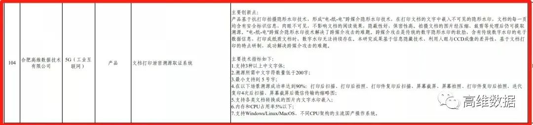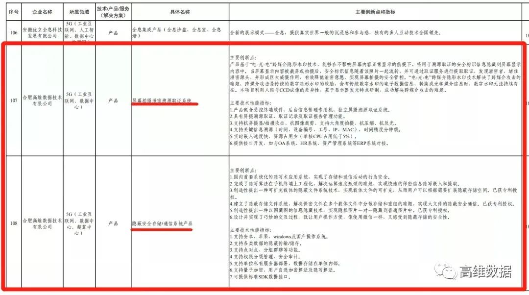 5月29日,安徽省正式发布全国首个新基建领域技术产品服务目录。高维数据申报的“屏幕拍摄溯源取证系统”、“网络数据隐蔽信息检测取证系统”等4个涉及5G、工业互联网、人工智能的创新产品成功入选!