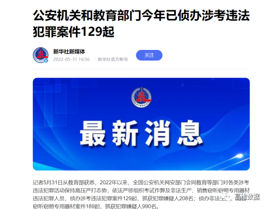 在2022年高考开考之前,教育部官网曾公布一组数据:2022年以来,全国公安机关网安部门会同教育等部门对各类涉考违法犯罪活动继续保持高压严打态势,依法严惩组织考试作弊及非法生产、销售窃听窃照专用器材违法犯罪人员,侦办涉考违法犯罪案件129起,抓获犯罪嫌疑人208名;侦办非法生产、销售窃听窃照专用器材案件189起,抓获犯罪嫌疑人990名。