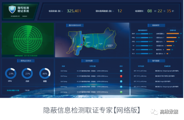 高维数据自主研发的面向网络大数据的隐蔽信息检测取证系列产品,是面向网络数据的新型检测取证工具,实现针对目标数据的"CT检测"效果。产品采用国际领先的信息隐藏相关技术,从多角度覆盖国内外已知隐写软件的指纹库,针对主流隐写软件进行检测,实现低虚警和低漏检的检测取证能力,是反恐取证、失泄密取证、舆情监测等不可或缺的技术手段,可有效帮助执法机关获得“猫鼠游戏”的主动权。