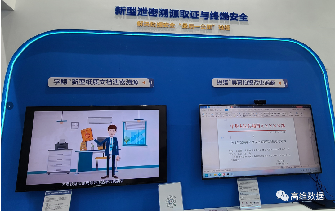 高维数据展区重点通过视频播放、互动体验、现场讲解等方式向观众们展示“行为安全”新理念及应用,新型泄密溯源取证理念与应用,让现场观众拿起手机就可以获得数据安全与隐私保护新体验。