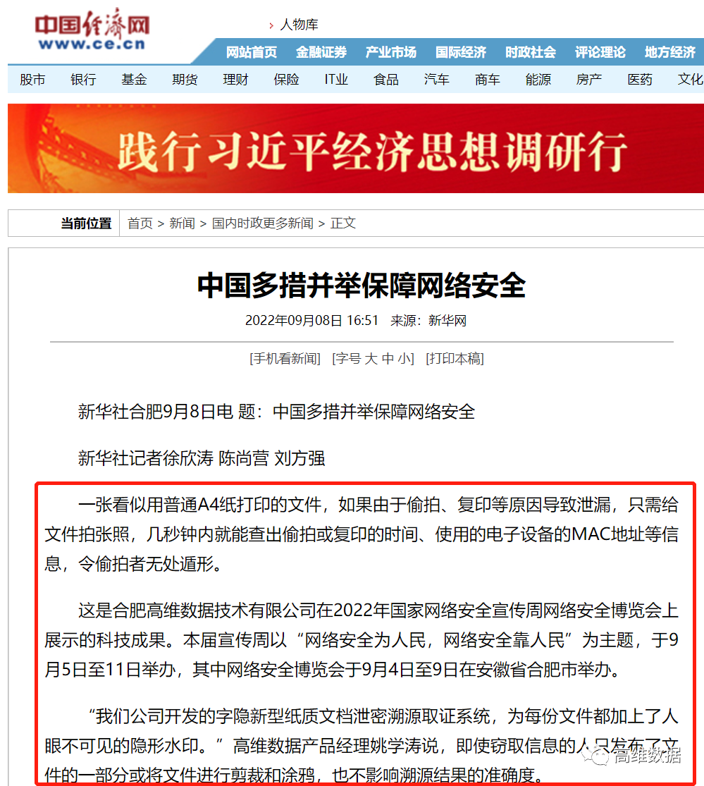 【中国经济网以《中国多措并举保障网络安全》、《自主网络安全技术亮相合肥》等文章,关注公司新产品、新技术。】;