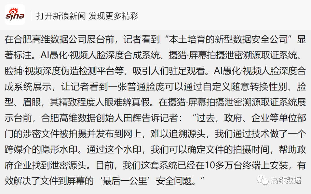 作为本土培育的新型数据安全公司,合肥高维数据技术有限公司携系列新型数据安全创新产品参展,并受到广泛关注,多家主流中央主流媒体,地方媒体、大型网络媒体等众多媒体聚焦报道、关注高维数据。