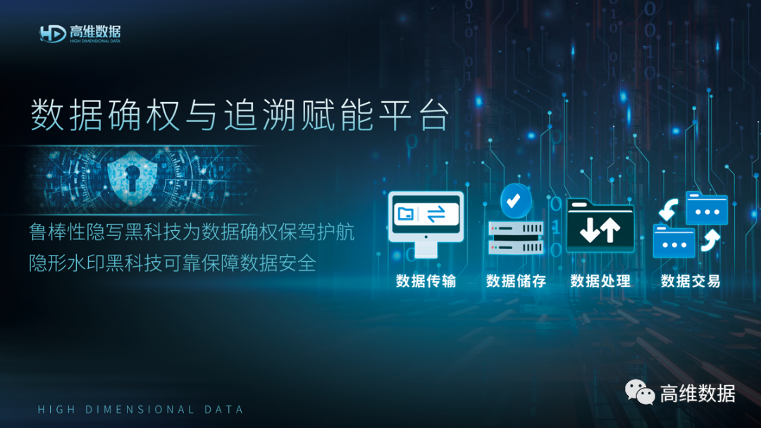 数字经济的高速发展过程中,数据共享与数据生产要素市场化面临两个主要难题:数据确权和责任追溯。高维数据基于在信息隐藏领域的长期技术积累,将明水印、跨媒介隐形水印、图像水印、视频水印、文本水印、数据库水印等水印技术融合,形成了Hi-saas®数据要素确权与追溯平台。在电子数据合法分享过程中,自动将用于溯源追踪的安全标识植入电子数据中,一旦发生侵权事件可以追溯责任源头。