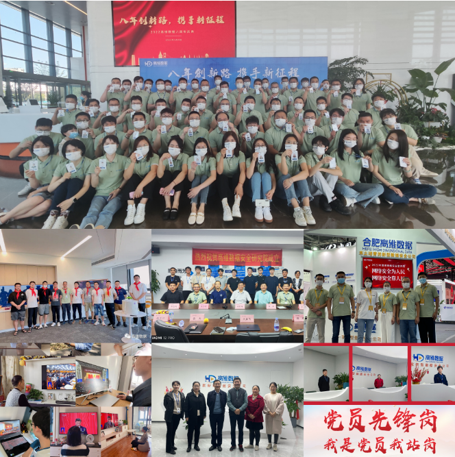 支部党员积极发挥先锋模范作用,启动“三亮”工程活动,鼓励党员“亮身份、亮承诺、亮业绩”,激发组织活力,增强党员的认同感和责任感,更好地在日常业务中发挥攻坚克难的模范带头作用。把支部活动与企业生产经营管理、企业文化、企业社会责任紧密结合,以党建促发展,成效明显。5月,“不忘初心跟党走 同心共筑中国梦”,助力公司八周年庆典圆满落幕;6月,“红色经典追忆艰苦岁月 员工庆生共谱甜美生活”,助力员工季度生日会顺利举行;7月,“党建引领 科创奋进”,助力高维数据安全研究院正式成立;8月,“铁血丹心,忠国不渝”,组织全体党员观看“安全教育”讲座;9月,“网络安全为人民 网络安全靠人民”,保障“2022国家网络安全博览会”顺利举行;10月,“创建新品牌 奋进新征程”,确定党建品牌名称“红星生辉 学习强司”;11月,“站好每日一班岗,我为党旗添光彩”,开展全体党员义务值班站岗活动;12月,“科技赋能发展,创新决胜未来”组织全体党员深入学习二十大精神,让高维人对“科技兴企”有了更加深刻的理解和认识。