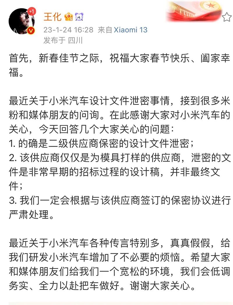 日前,上海证券报官微发布了小米汽车设计文件提前遭泄露的信息,针对本次泄密事情,小米集团公关部总经理王化进行了正面回应,并表示将严肃处理相关供应商。