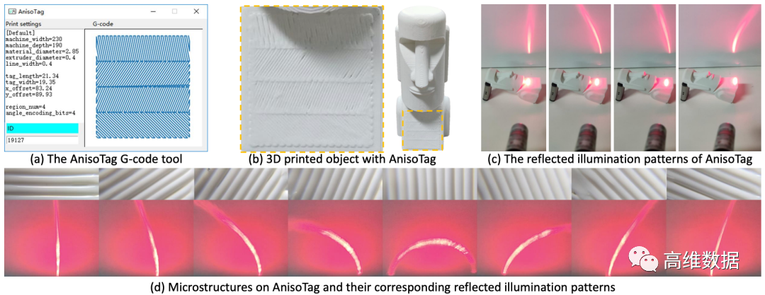 分享一篇研究团队关于一种在3D打印对象的2D表面上编码数据的新型标签方法AnisoTag 的文章:在过去几年中,3D打印技术的广泛使用促进了3D打印产品市场的增长。受机器可读标签(如条形码) 对日常产品营销的积极影响的启发,本文提出了AnisoTag,这是一种基于反射各向异性在3D打印对象的2D表面上编码数据的新型标签方法。