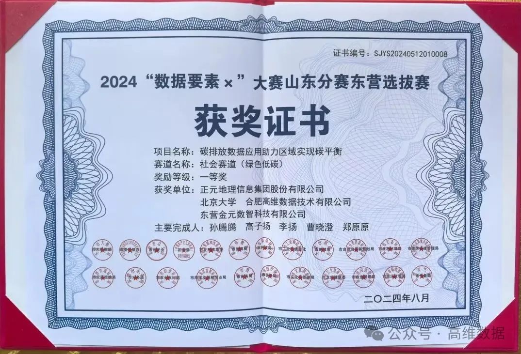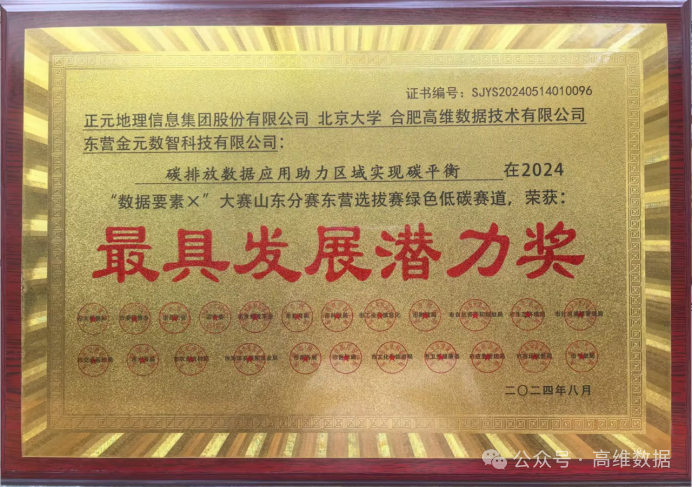 高维数据联合北京大学、正元地理信息集团股份有限公司、东营金元数智科技有限公司共同申报和打造“碳排放数据应用助力区域实现碳平衡”项目参与本项比赛,经县区初审、市级复审、专家评审等多个环节,本项目从170余个作品中脱颖而出,荣获“数据要素X”大赛山东分赛东营选拔赛一等奖和最具发展潜力奖。