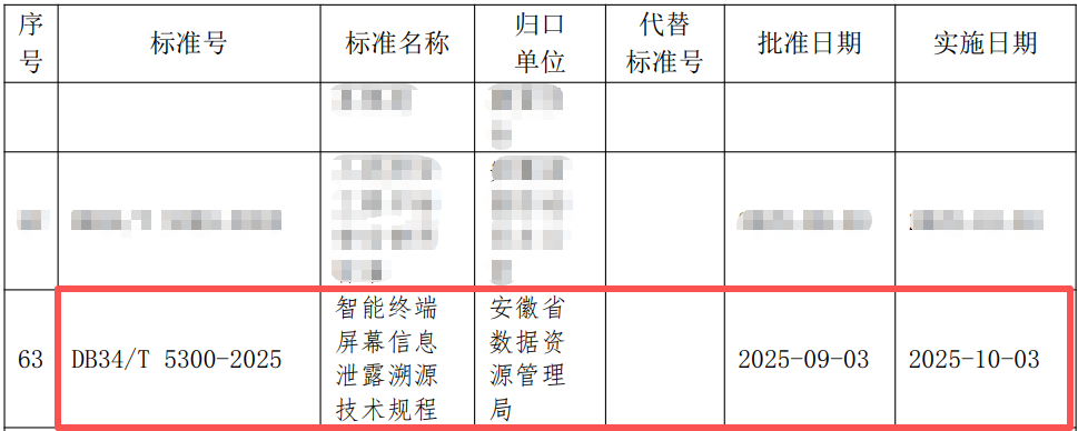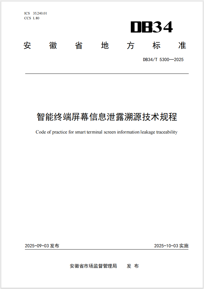 近日,由安徽省数据资源管理局归口的安徽省地方标准《智能终端屏幕信息泄露溯源技术规程》(DB34/T 5300-2025)经安徽省市场监督管理局批准正式发布。该标准由合肥高维数据技术有限公司牵头,联合中国科学技术大学、安徽省数字江淮中心、合肥市大数据资产运营有限公司共同起草编制。