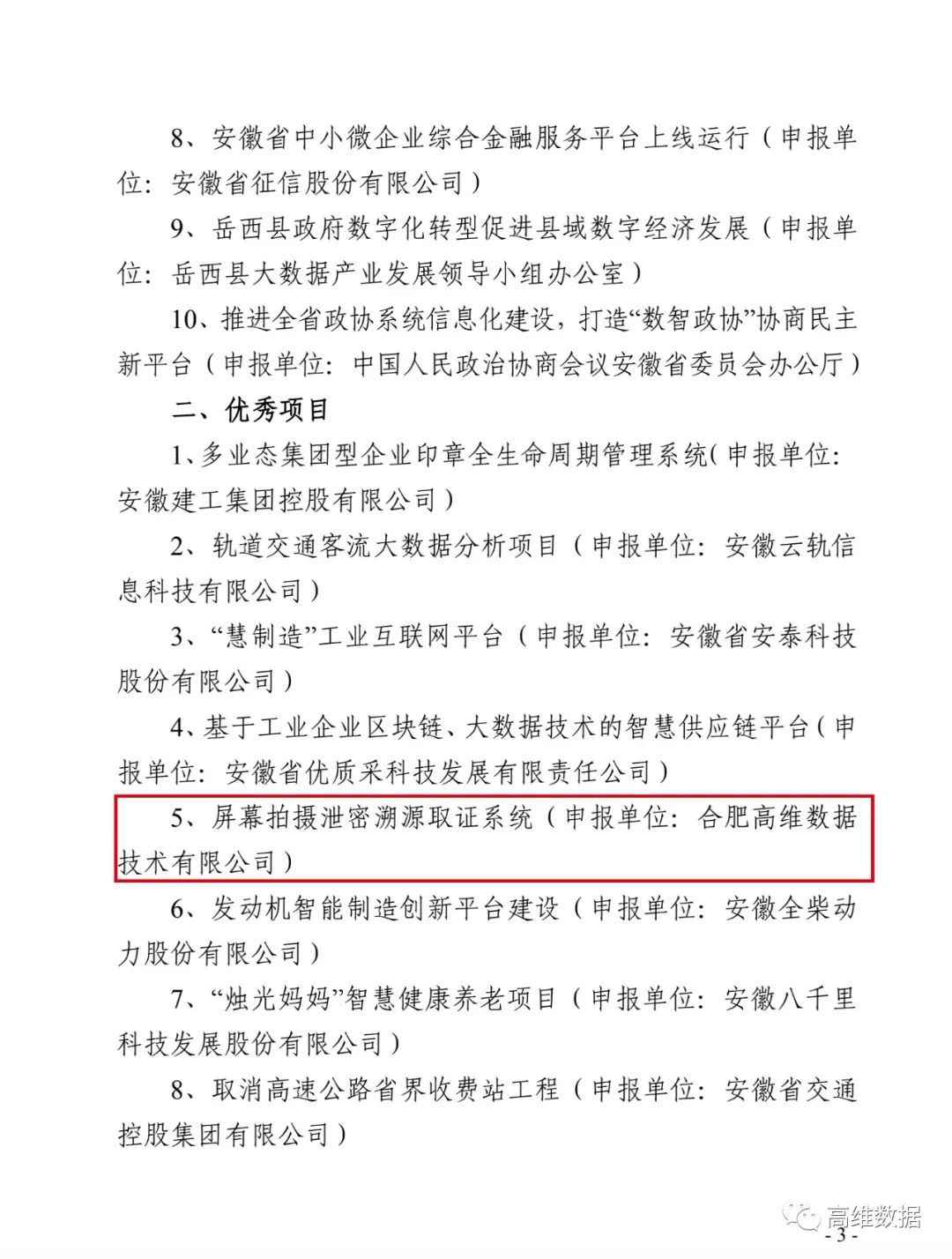近日,由安徽省信息化协会主办的2019年度第24届“安徽省信息化十件大事”评选结果正式揭晓,高维数据申报的“屏幕拍摄泄密溯源取证系统”成功入选“安徽省信息化十件大事”。