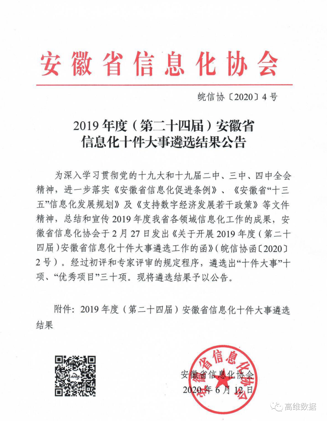 本次优秀项目评选活动,是由安徽省信息化协会发起,旨在深入学习贯彻党的十九大和十九届二中、三中、四中全会精神,进一步落实《安徽省信息化促进条例》、《安徽省“十三五”信息化发展规划》及《支持数字经济发展若干政策》等精神,总结和宣传2019年度我省各领域信息化工作的成果。本次评选经过初评和专家评审的规定程序,最终遴选出“十件大事”10项、“优秀项目”30项。