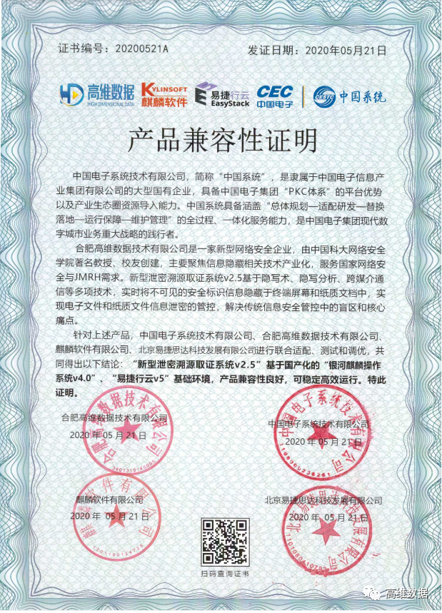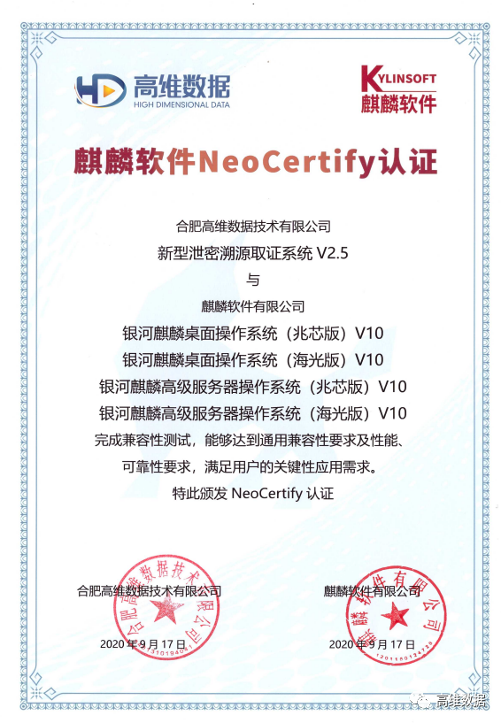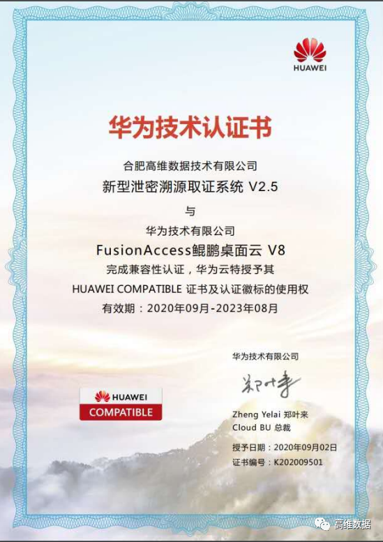 9月份,高维数据在继续推进产品国产化工作,陆续完成与华为、统信OS、麒麟OS等主流平台完成深度融合。公司产品《新型泄密溯源取证系统 V2.5》与华为鲲鹏云桌面V8完成兼容性认证,华为云特授予HUAWEI COMPATIBLE 证书及认证徽标的使用权。