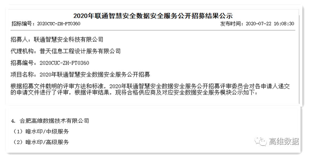 8月,招标代理机构中国普天发布“2020年联通智慧安全数据安全服务”公开招募结果公示,高维数据暗水印技术入围。此次入围,是业界对高维数据新型泄密溯源取证产品和技术的认可,对公司拓展运营商及相关业务具有重要意义。