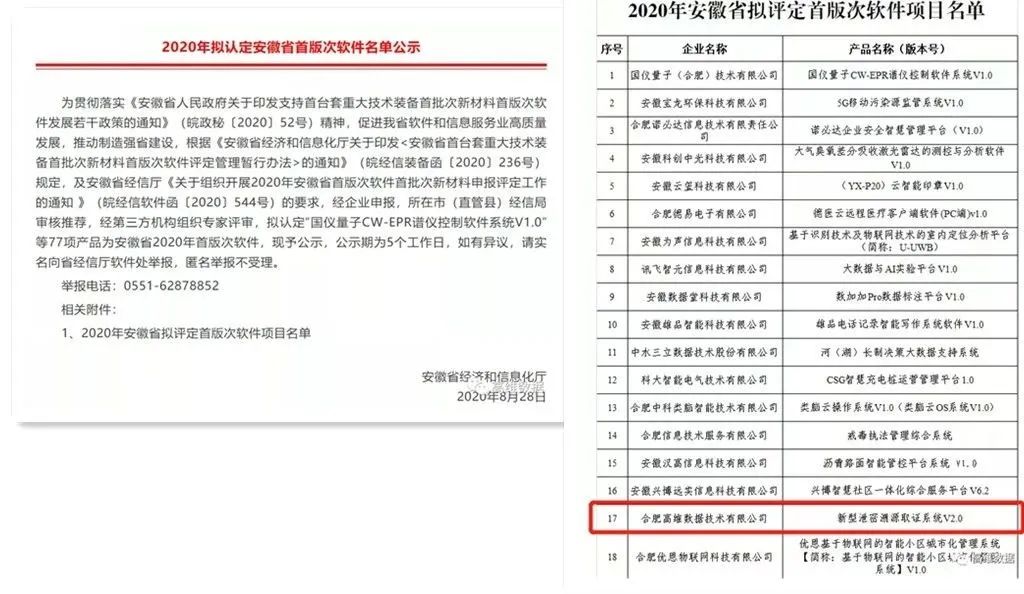 8月28日,安徽省经济和信息化厅官网发布“2020年安徽省拟评定首版次软件项目名单”,经市(直管县)经信局审核推荐,第三方机构组织专家评审,全省最终共77个产品入选。高维数据新产品“新型泄密溯源取证系统V2.0”入选