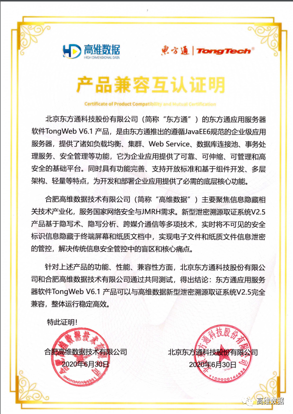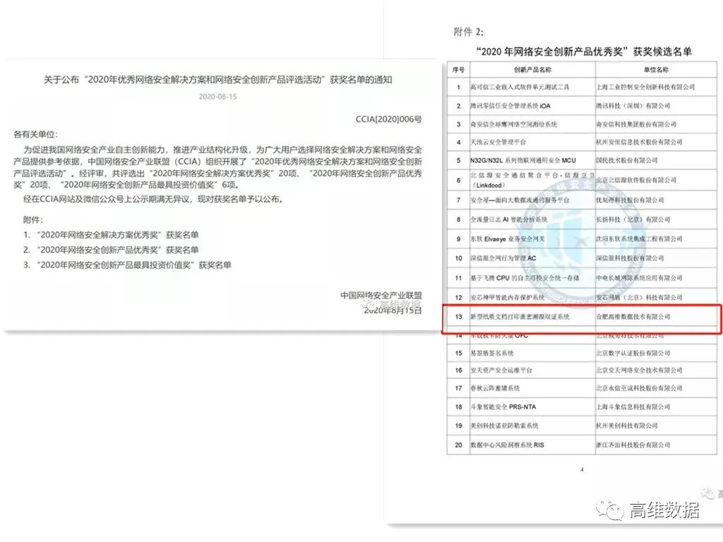 8月15日,中国网络安全产业联盟(CCIA)官网发布了《关于“2020年优秀网络安全解决方案和网络安全创新产品评选活动”获奖名单》。在经过网络安全行业知名专家、投资机构等初审和复评,结合网络投票情况,高维数据的申报的“新型纸质文档打印泄密溯源取证系统“获得业内专家评委的认可,获“2020年网络安全创新产品优秀奖”。